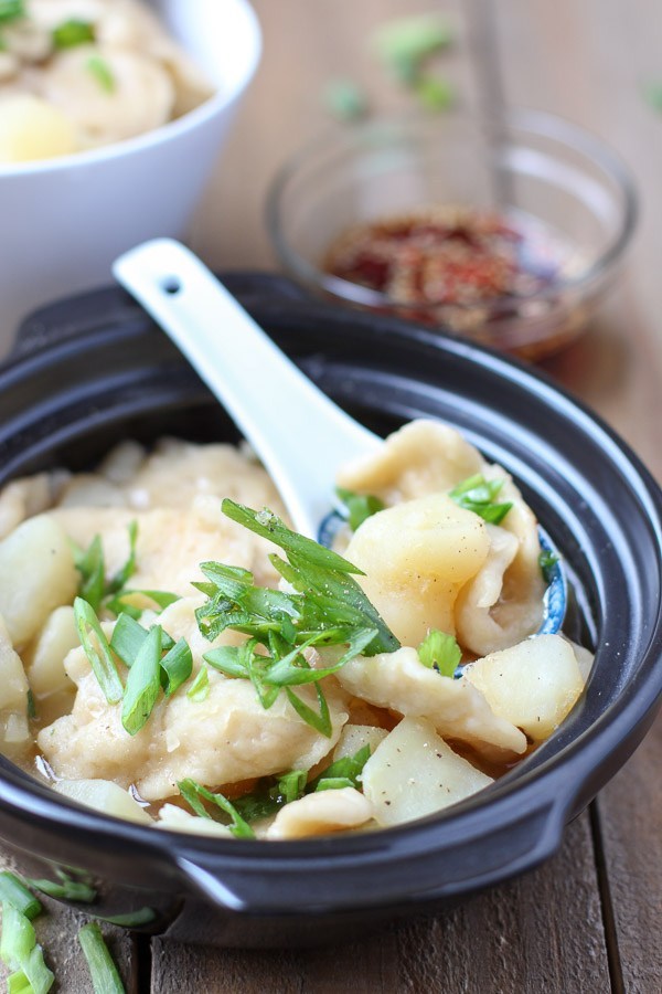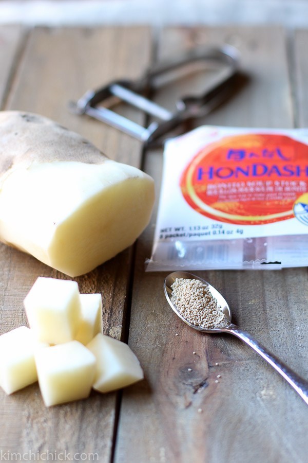 Sujebi is a traditional Korean soup that is rich with umami flavor. The umami-ness in this dish comes from dashi, the same dashi used in my Spicy Tofu Stew. Although dashi can be made using dried kelp and bonito flakes, it is now packaged and sold as a seasoning powder called hondashi. Hondashi and soy sauce together create this flavorful broth. Potatoes and hand torn dough thicken it and deliver warmth and comfort in each bite. I love this soup anytime of year, but it feels most rejuvenating on rainy days and cold nights.