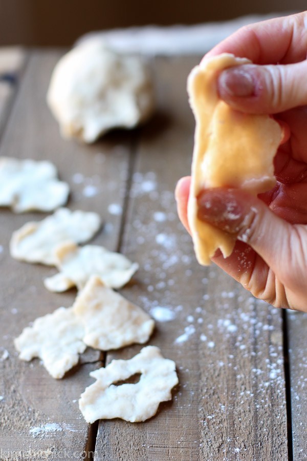 This hand torn noodle and potato soup is a one pot dish, which makes clean up so easy! After the broth and potatoes come to a boil, I tear off a piece of dough and flatten them into thin discs. Each noodle is unique in shape, some tear and that’s perfectly alright. That is what makes this soup so rustic. Drop the noodles right into the boiling pot. It’s as simple as that!